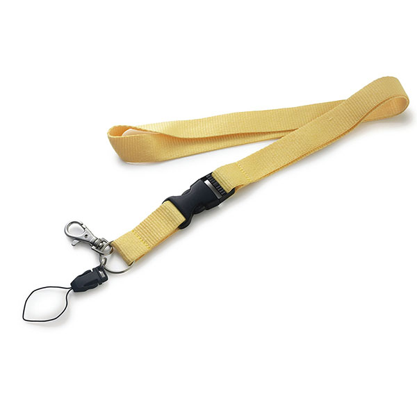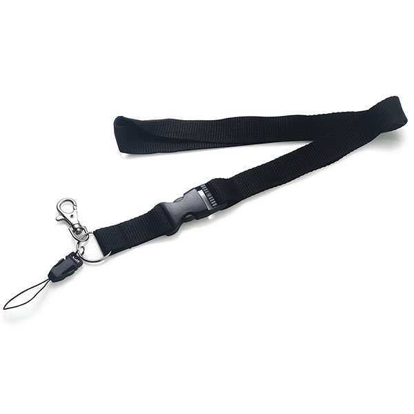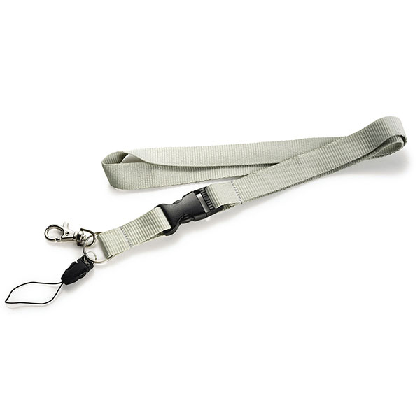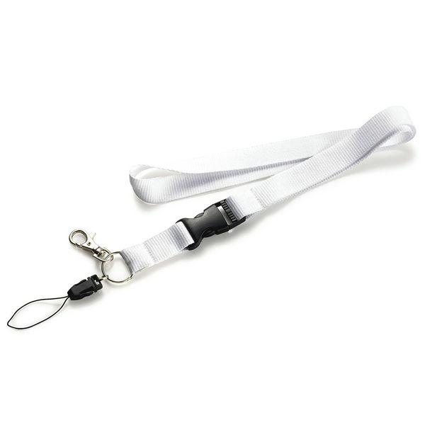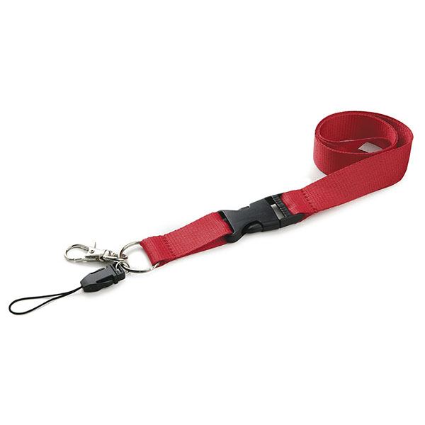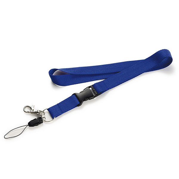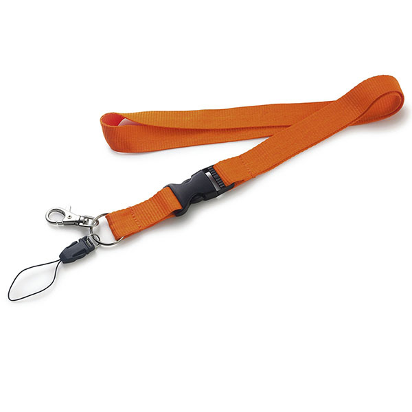 Lanyard with metallic hook, detachable clip and safety. Dimensions: 2 cm W x 50 cm H. Colours: black, white, green, blue, red, yellow, orange and grey.